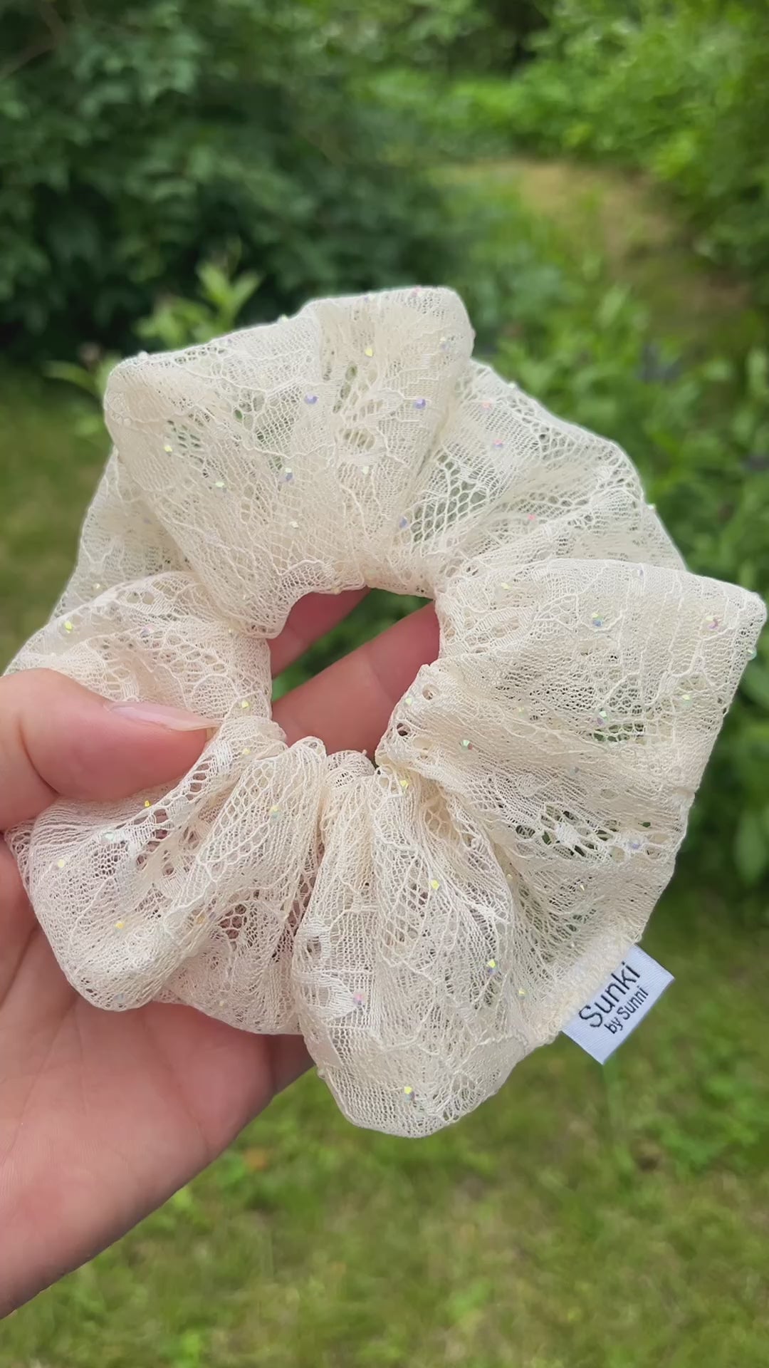 Håndlaget scrunchie i en nydelig offwhite blonde med strasstener.